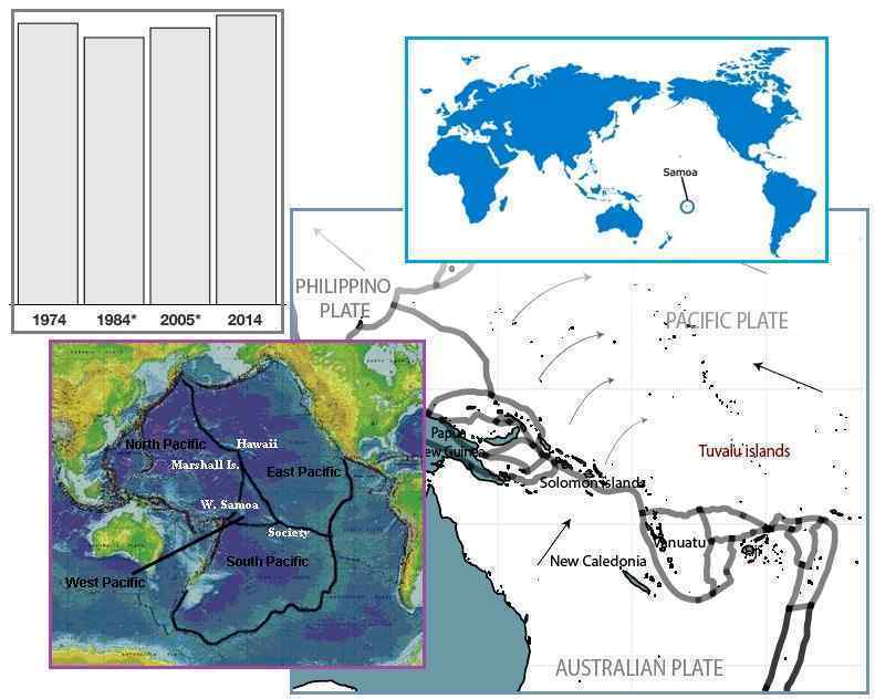 サモアに場所を与えている太平洋プレートの部分が、ポールシフトの1時間の間に、著しく上昇するだろうと、私達は予測しました。 太平洋は、一つのプレートではなく、★4つのプレートであり、もっともこれらのプレートの境界に沿った活動のほとんどは、波の下方で起こっており、人類には見分けられません。 最近、★アリューシャン列島沖合での顕著な地震の間、★太平洋は、収縮しました。 この圧縮の間、ハワイ諸島と日本は、多分上昇しました。 傾いているフィリピンプレートの東の縁は、多分上昇しました。 そして予測されたように、サモアとツバルを支えるプレートの部分もまた上昇しました。 私達が★北極プレートと呼ぶプレートの部分は、これらの調整の間、押し下げられます。 これは、過去に進行していたのと同様に進んでいく、“★間断のない進行”です。