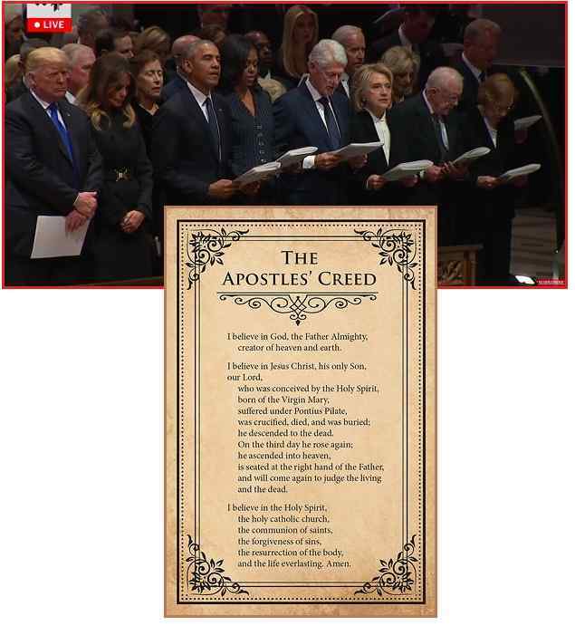 トランプ大統領が、水曜日にジョージ・H・W・ブッシュの葬儀の間、元大統領達、オバマ、クリントン、カーターおよび彼等の妻達の傍らに立った際に、★彼と大統領夫人メラニア以外の全員は、使途信経を朗誦しているのを見られました。