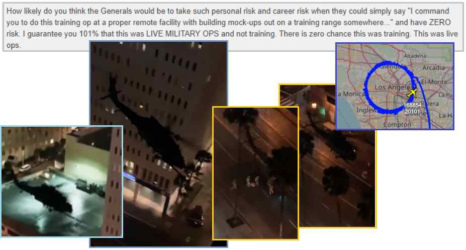 米国軍は、“都市環境での(軍事)作戦”により陸軍特殊部隊の技能を高めるという目標で、土曜日までロサンゼルス大都市圏全域にわたって★戦争訓練を継続します。 ★ロサンゼルスダウンタウンの居住者達は、ボーイングA/MH‐6MリトルバードとシコルスキーUH‐60ブラックホークヘリコプターの飛行部隊が彼等の周囲に急襲した月曜日の夜に、衝撃を受けました。 ★特別部隊は、駐車場で訓練演習をおこない、それから警察が近くの交差点を封鎖した間に、110高速道路から離陸する前に、ヘリコプターによって収容されました。