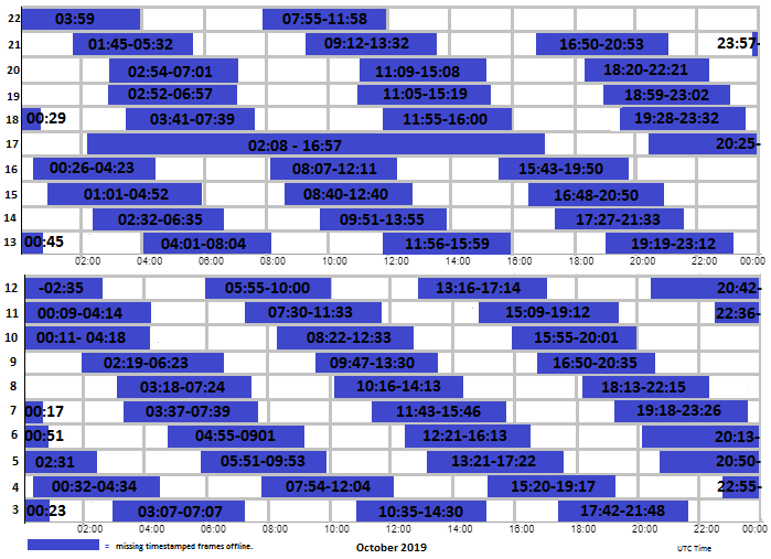 ★2019年10月3日から10月22日まで、1日の長さと時間、そしてBATSRUSの画像が毎日行方不明になる/省略されるときを示す下方のこの最初の図表にまとめています。