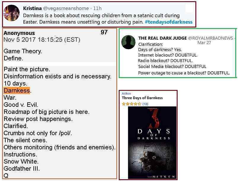 Qは、2017年に彼の初期の投稿の一つ―#97―でゲーム説を描写しました。 謎めいたQは、パズルやコードで話すことで知られており、ゆえに“暗闇の10日間”であるように受け取れることへの彼の言及は、実際につづりを間違えた言葉を含みます。 ★“Darnkess(Darkness=暗闇)”は、子供達の性的虐待―“3日間の暗闇”―と、復活祭へと進む彼等の救助についての本の中に発見されたつづり間違いです。