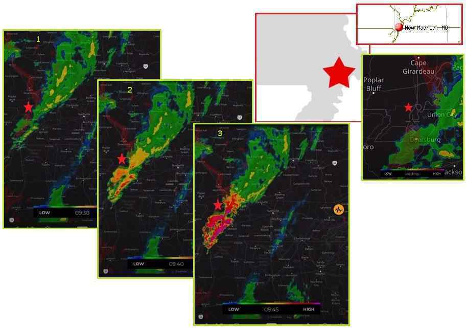 2020年4月29日に起こりました。 奇妙な“閃光”が短時間[9:50に異常な色彩とともに、]続いただけの異常な色合いとともに嵐レーダーの表示の内部に示されました。 ★川の屈曲部でその下の川に沿って走るニューマドリッド断層線と、★閃光のわずかに左上方にニューマドリッドの町そのものを、あなた方は見ることができます。