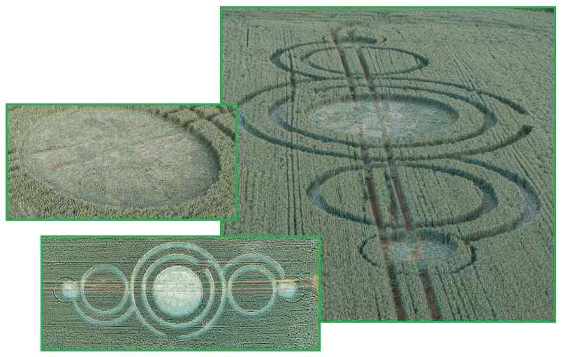 このエレガントなミステリーサークルには、6月の食、すなわち月食(6月5日)と6月21日の日食の期間内の太陽、月および地球の配置の象徴を、私達は見ます。 中央の太陽、2個の軌道(水星と金星)と地球の連鎖が月(三日月形)によってたどられた地球を見ます。 日食の日の太陽系の地図を評価すると、私達は、ほとんどの惑星達が宇宙空間の単一の方向に無理なく整列されると、私達は注目します。 亀裂が磁場の欠落を象徴します。 そして2つの亀裂の間の角度は、カナダからロシアまで極から転移することを象徴するかもしれません。