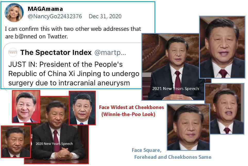 習の2021年の新年の演説を調べてください。 ★彼が痩せていることに注目してください、彼の顔の動きは異常で、彼の両手は、演説全体の間凍り付いています。 それから習の、より古いビデオを調べてください。